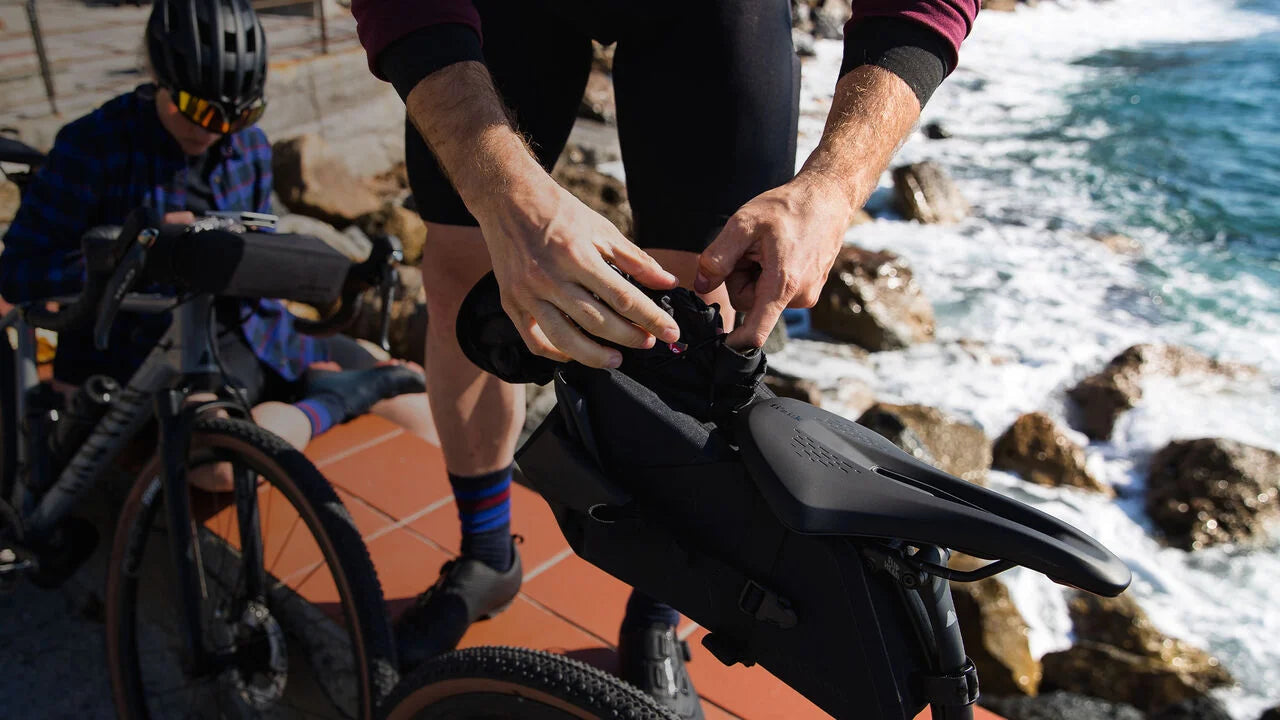 La sacoche de selle 5L s’installe sous la selle et se fixe à la tige de selle.